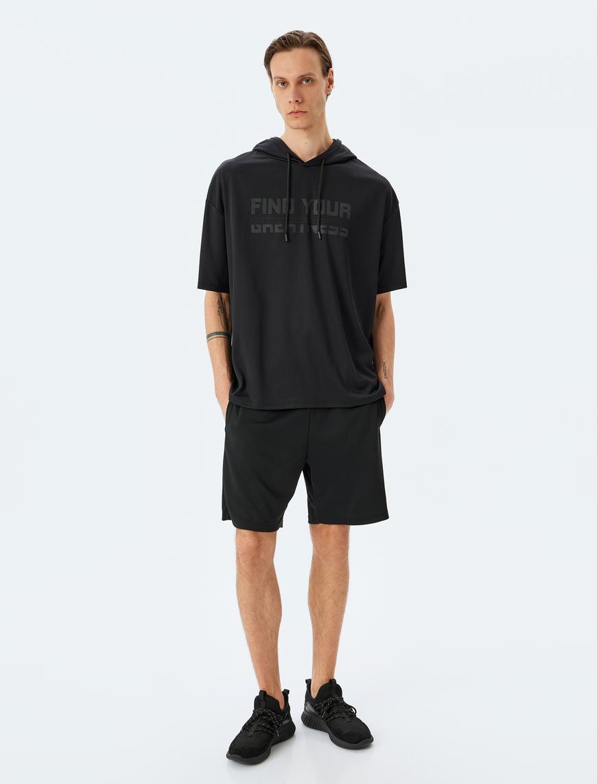 Koton Homme – T-shirt de sport à capuche oversize à manches mi-longues et slogan imprimé – Noir
