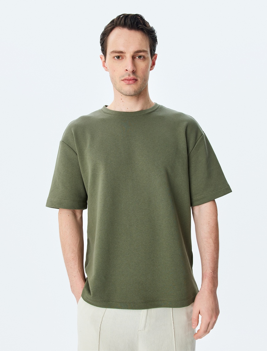 Koton Homme – T-shirt oversize à manches courtes et col ras du cou en tissu uni avec étiquette détaillée – KAKI