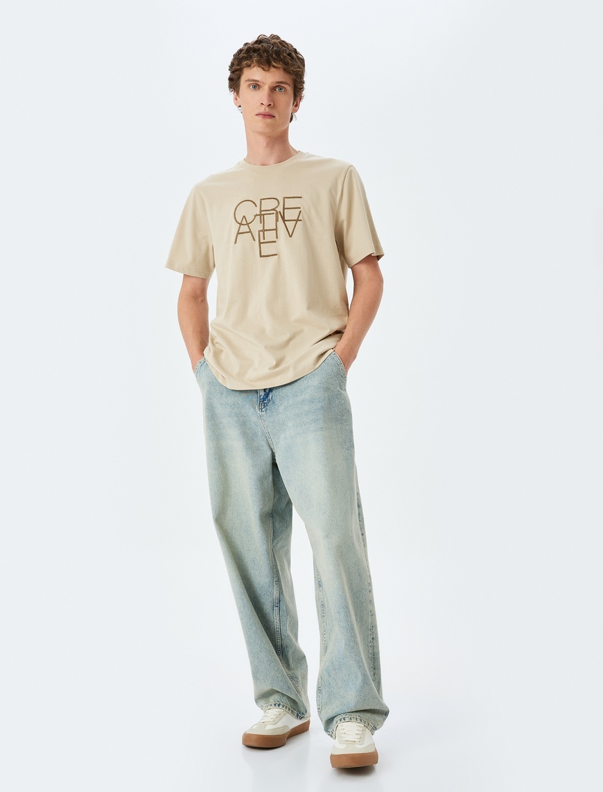 Koton Homme – T-shirt à manches courtes, coupe classique, col ras du cou, en coton, avec slogan imprimé – Beige