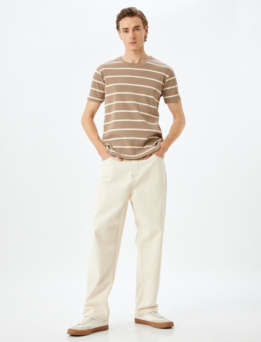 Koton Homme – T-shirt slim à manches courtes et col ras du cou en coton mélangé – Marron rayé